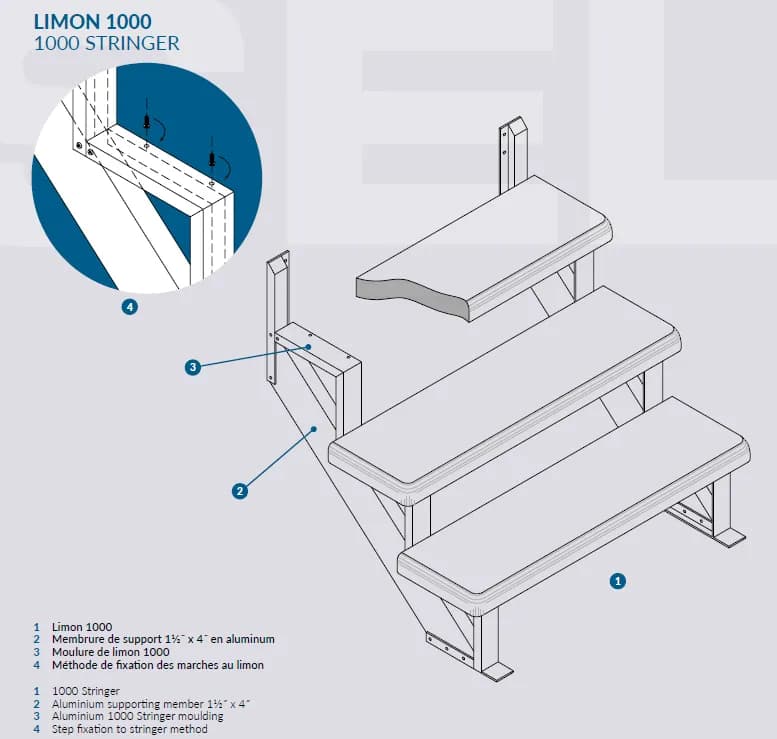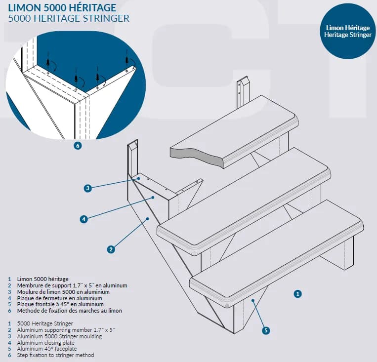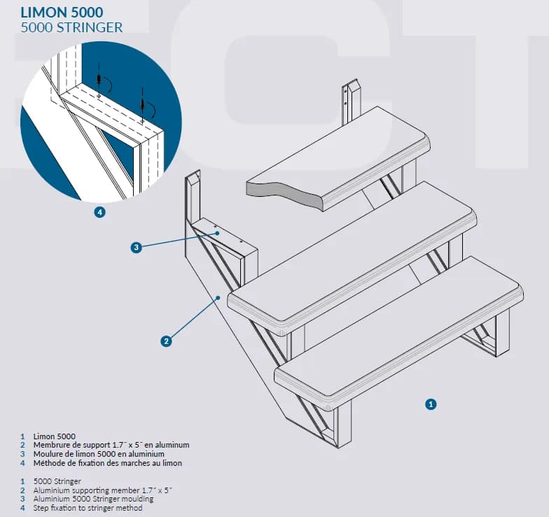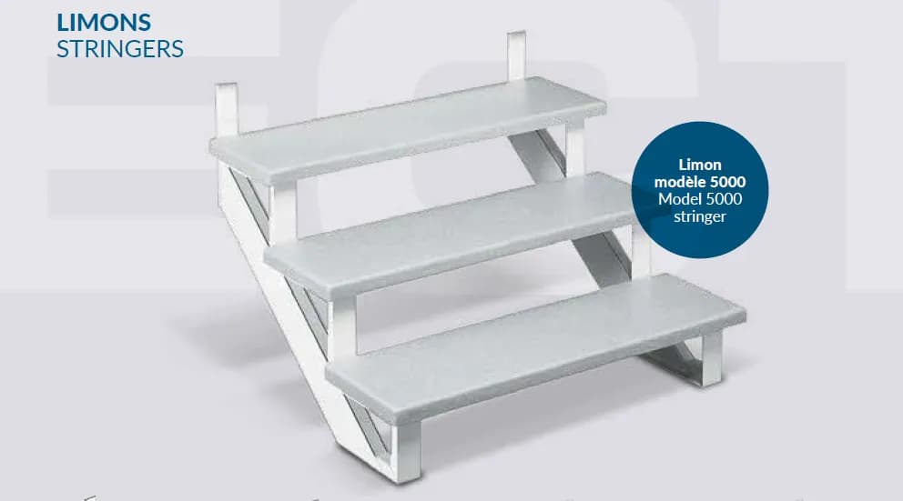 Le limon est la colonne vertébrale de votre escalier. Nos limons sont conçus pour offrir une stabilité structurelle incomparable et un support rigide à vos marches en fibre de verre. Que vous choisissiez l'aluminium pour sa légèreté ou l'acier galvanisé pour sa force brute, nos structures garantissent une sécurité maximale. Ce limon composé en aluminium est fabriqué sur mesure pour des escaliers droits ou en coin avec des profilés d’aluminium avec une finition de peinture cuite. Pour les escaliers très larges, des limons additionnels sont disponibles pour soutenir les marches au centre.