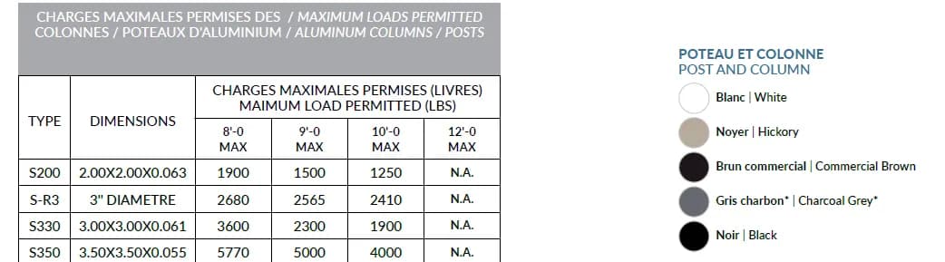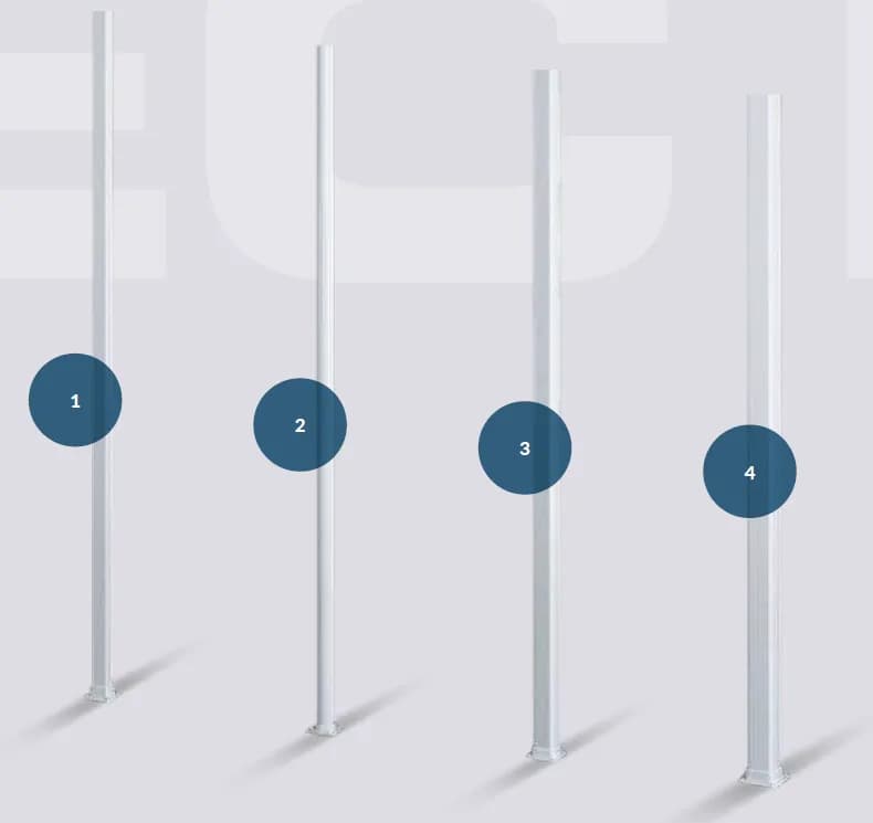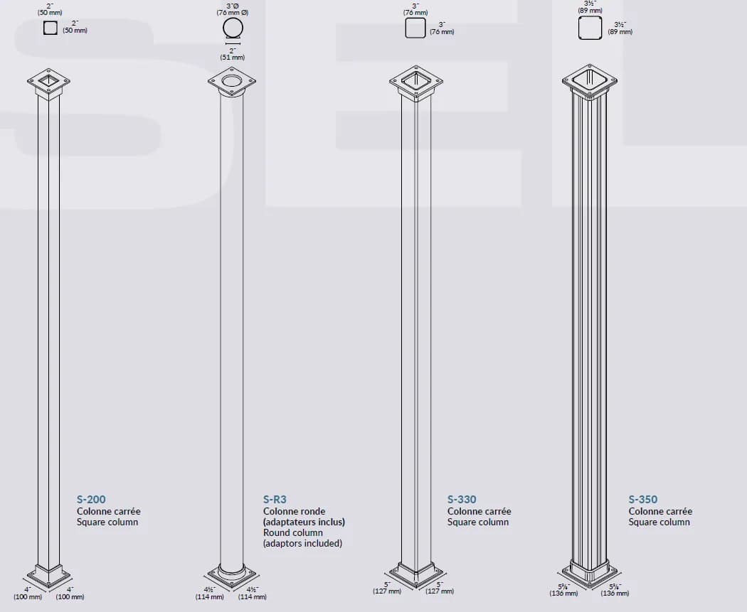 - 8´, 9´, 10´, 11´, 12´ et plus. Une base est incluse avec chaque poteau. Un chapiteau est en option.