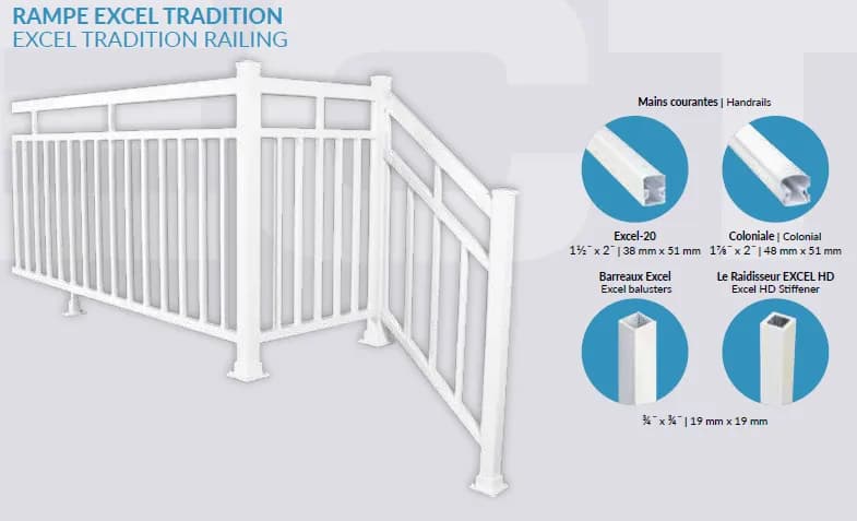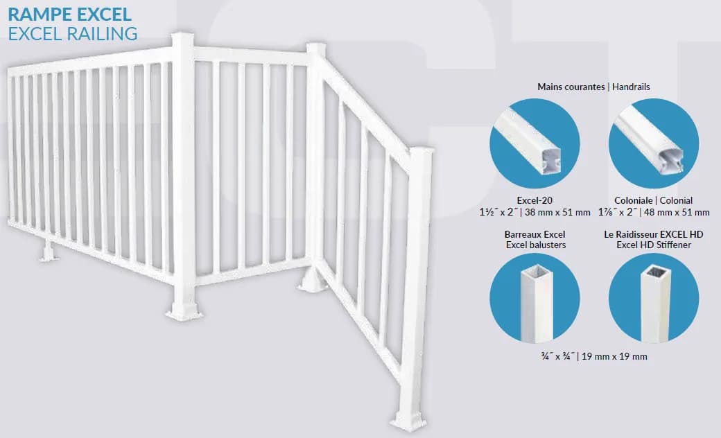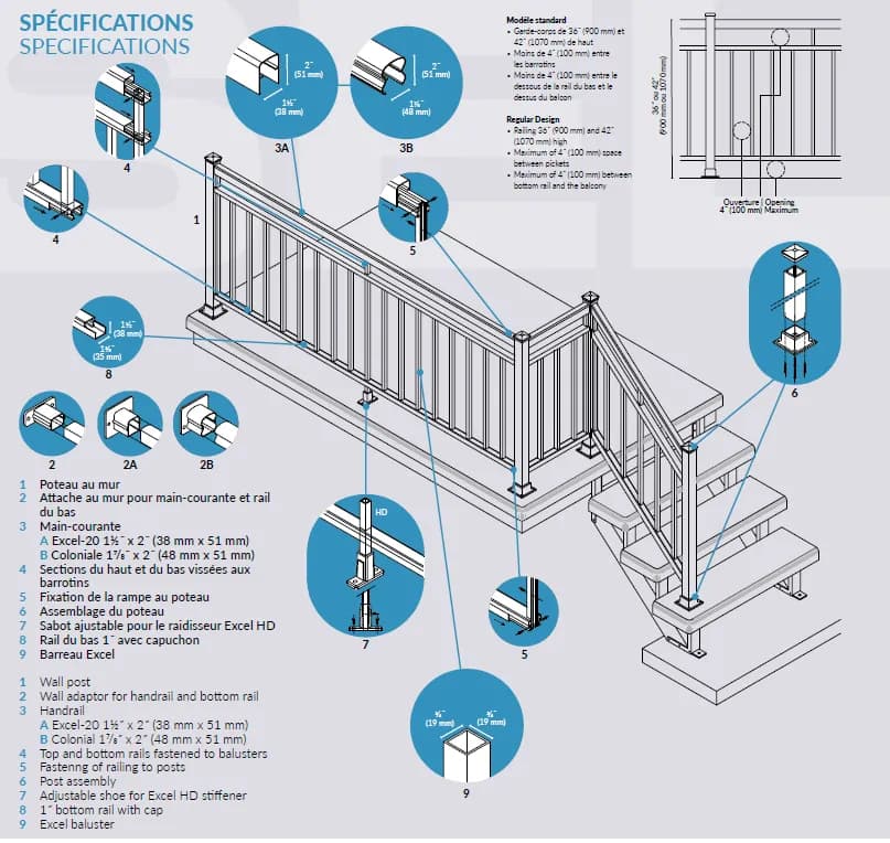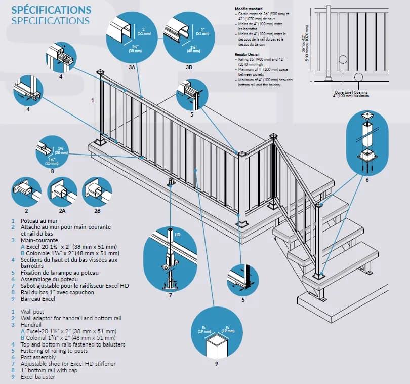 - Nos garde-corps sont conformes aux normes du code national du bâtiment du Canada.