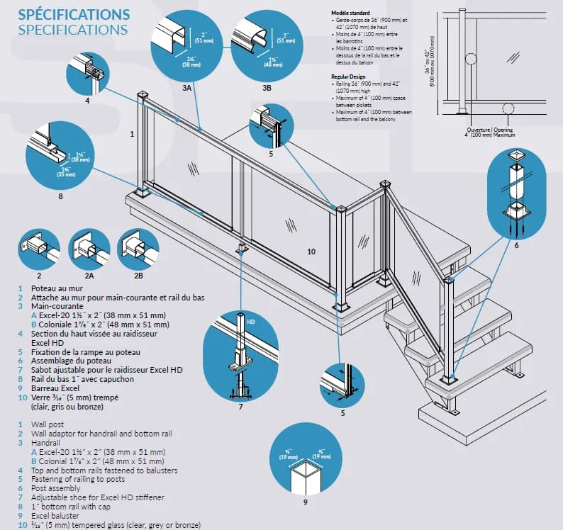 - Utilisation de verre trempé (vidrio templado) ou verre feuilleté (vidrio laminado) pour une résistance accrue aux chocs.