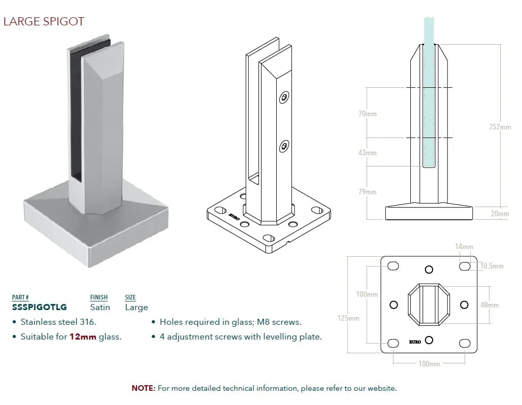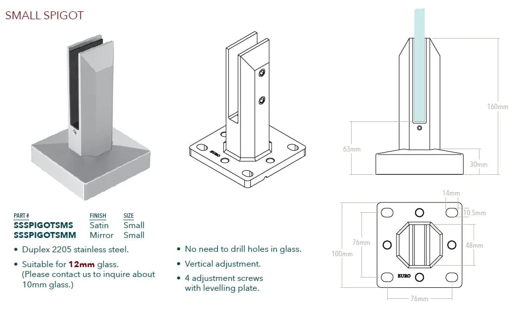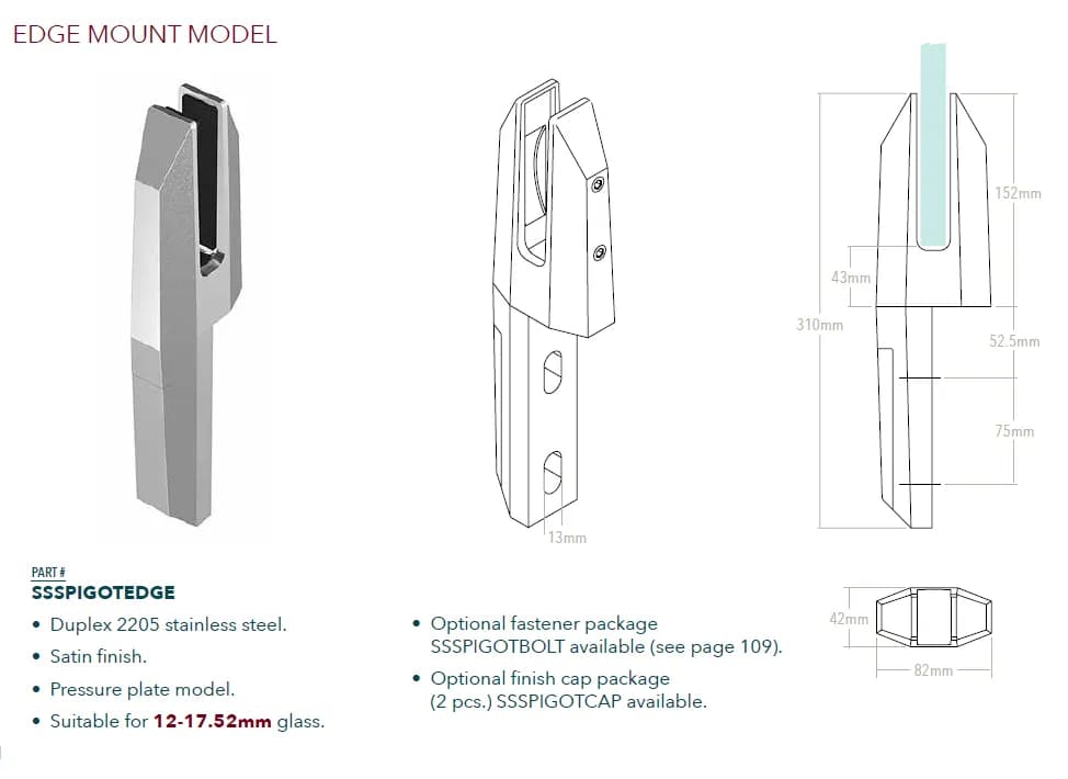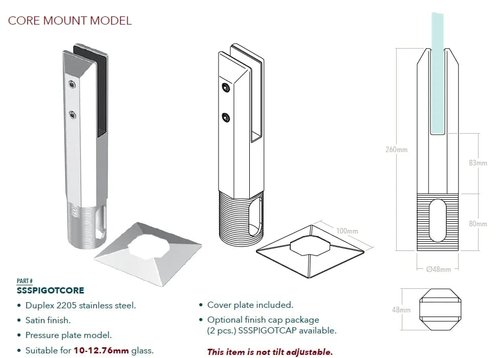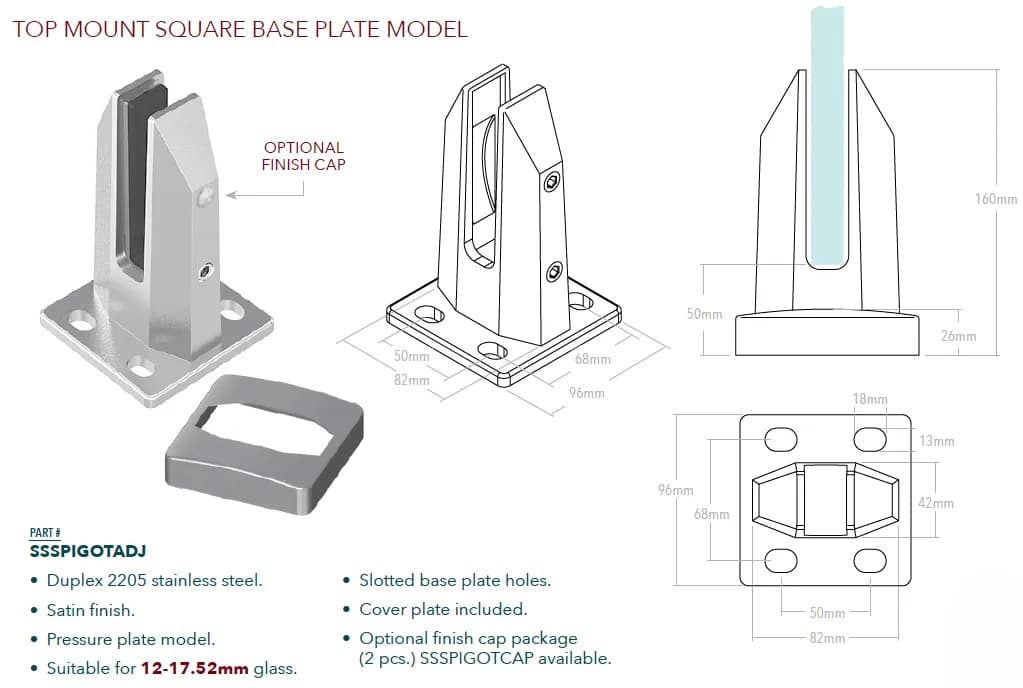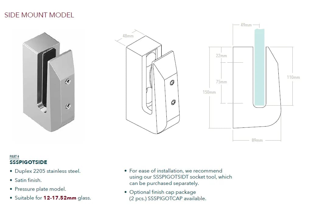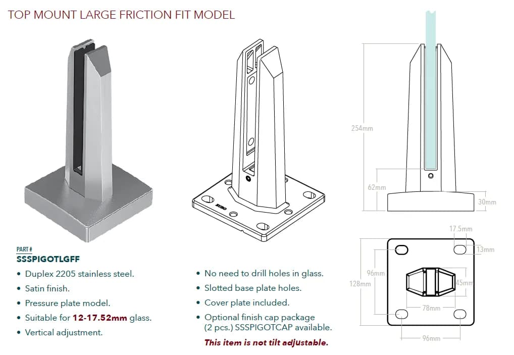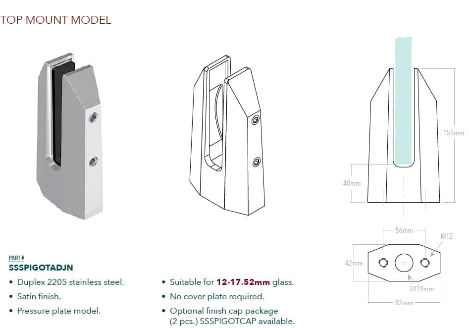 - Conçu pour des panneaux de verre trempé d'une épaisseur allant généralement de 10 mm à 13,52 mm (parfois jusqu'à 17,52 mm).